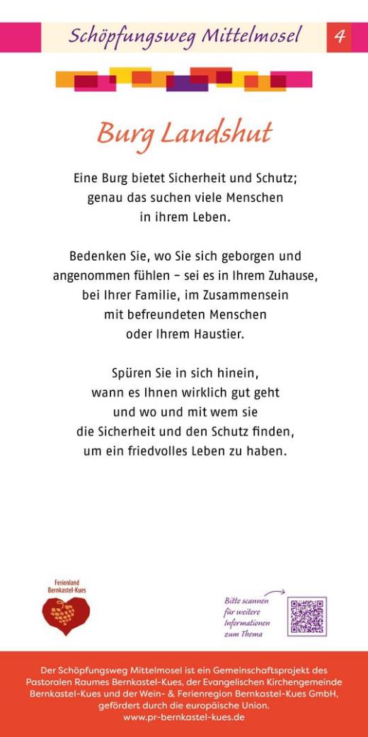Möchten Sie einen nahe dieser Stele gelegenen geistlichen Ort erkunden? Die Fierskapelle, ein malerisch über Kues gelegenes Kleinod mit einem wunderschönen Ausblick über die Doppelstadt, ist nur 400 Meter von Station 4 entfernt!